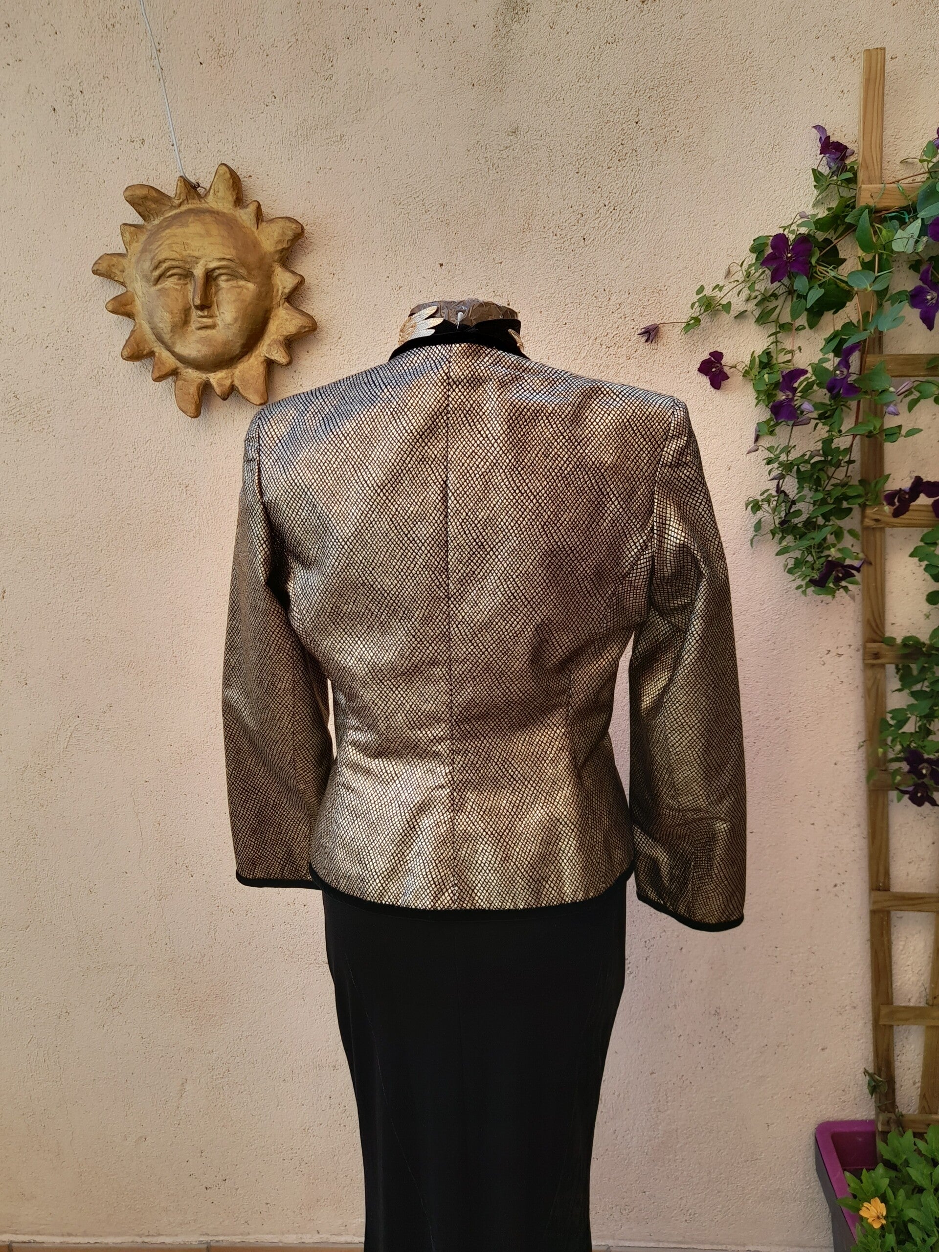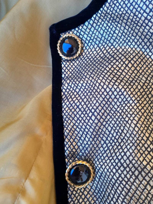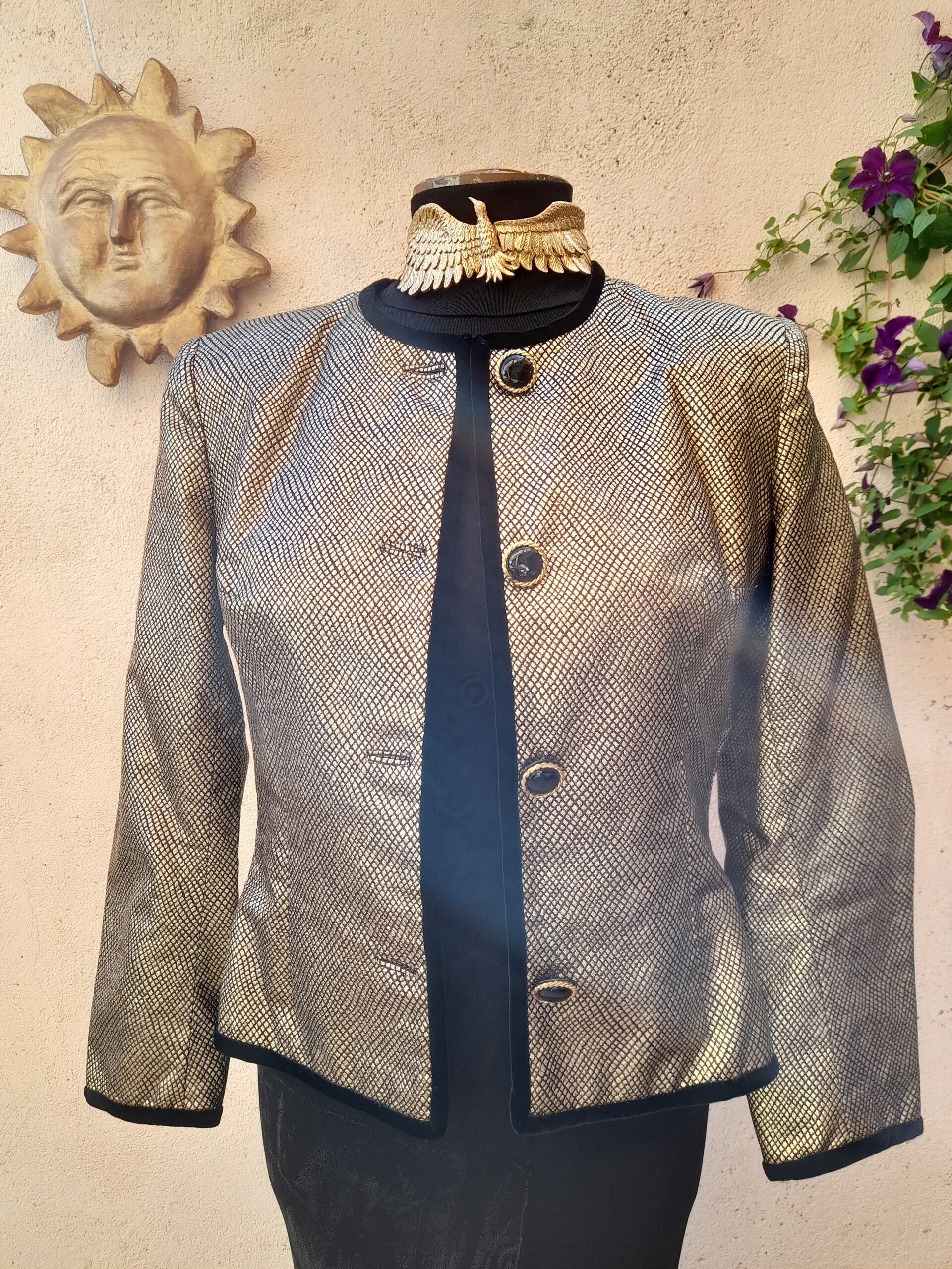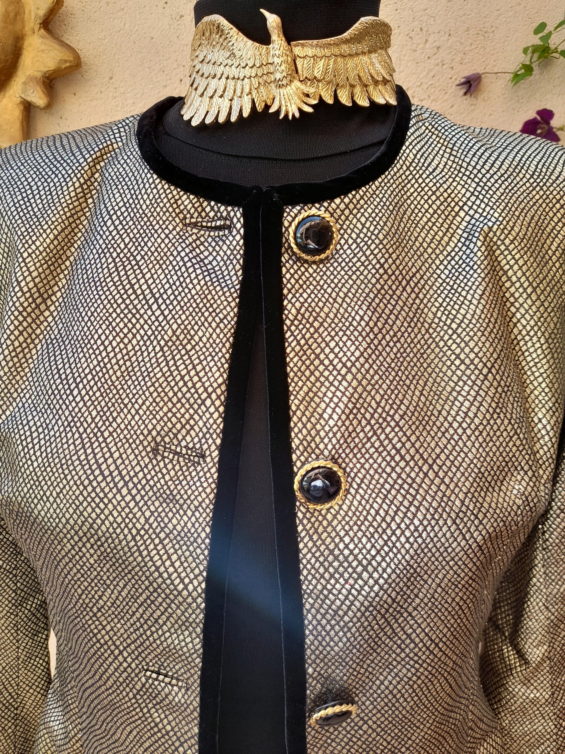 Sublime veste style Chanel en lurex noir et or doré et boutons assortis passepoil de velour noir . Doublure en soie jaune doré .