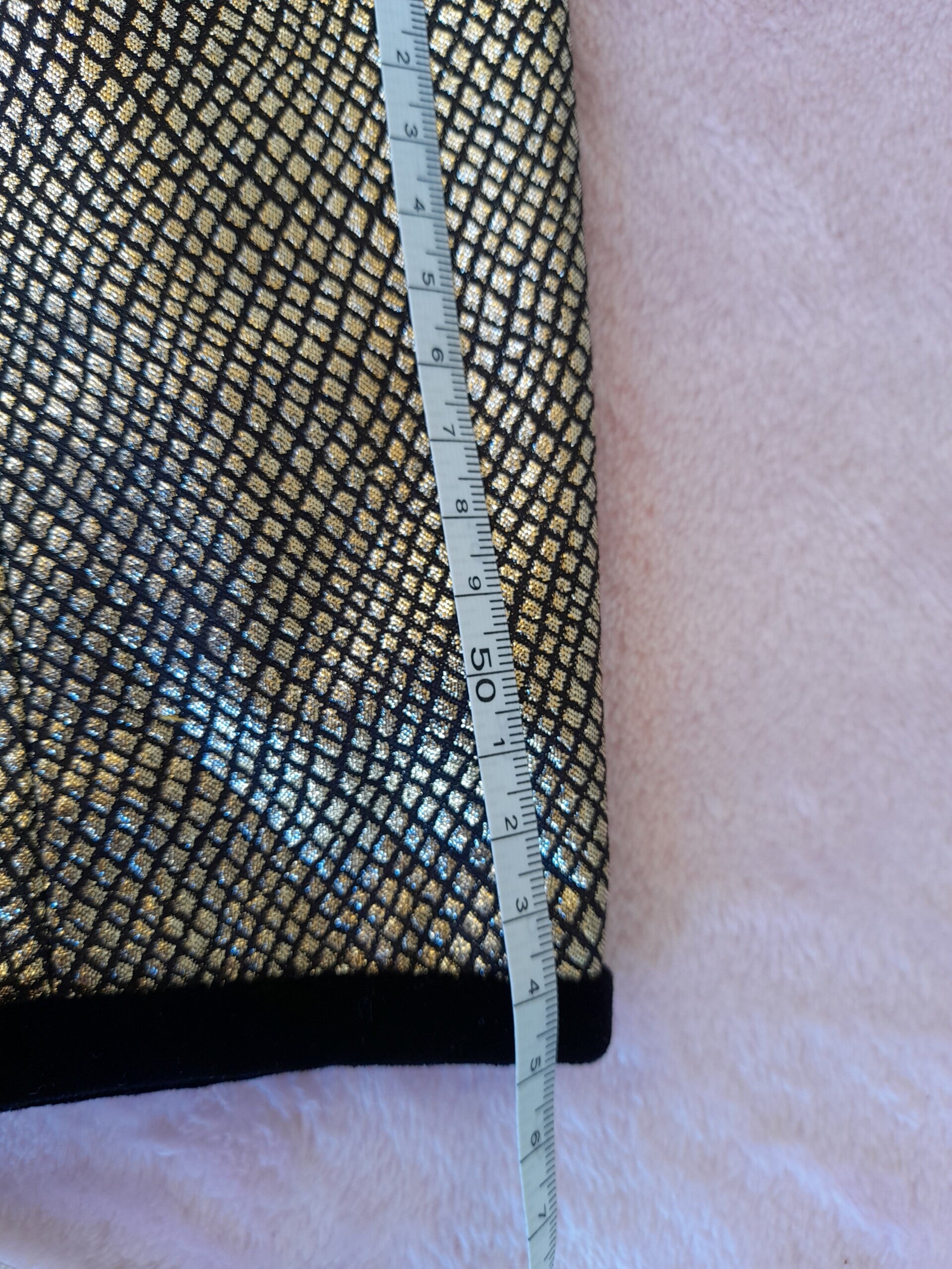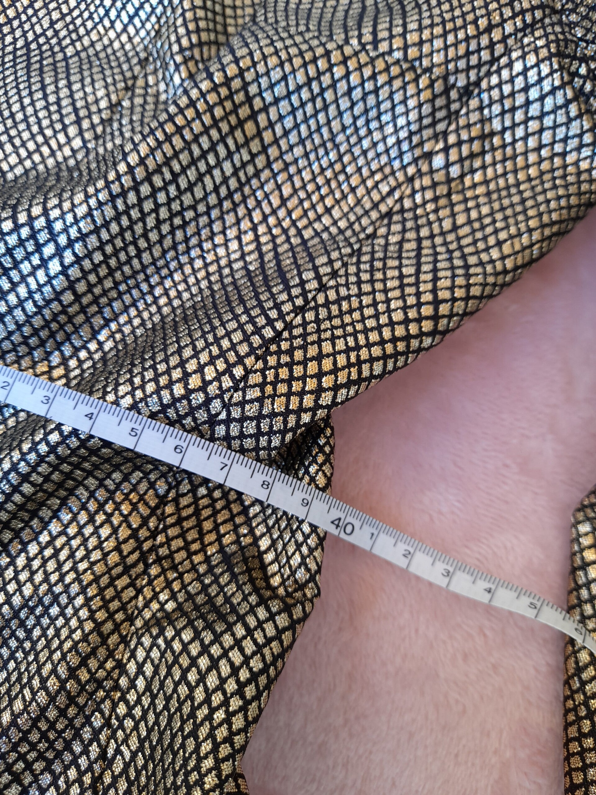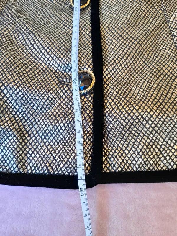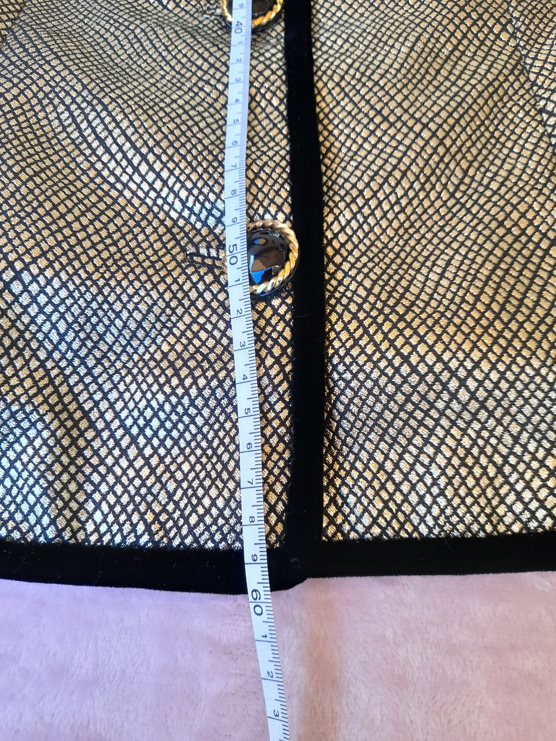 Sublime veste style Chanel en lurex noir et or doré et boutons assortis passepoil de velour noir . Doublure en soie jaune doré .