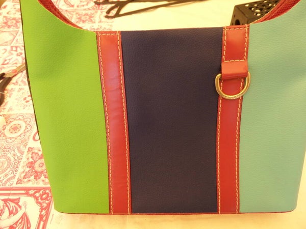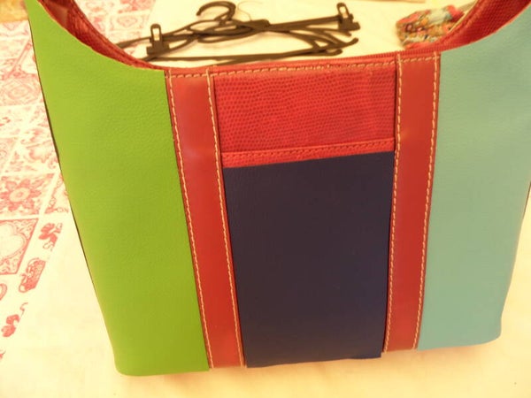 Refashion = refait, modernisé, par moi même avec soins : cuir tricolore : vert, bleu, turquoise